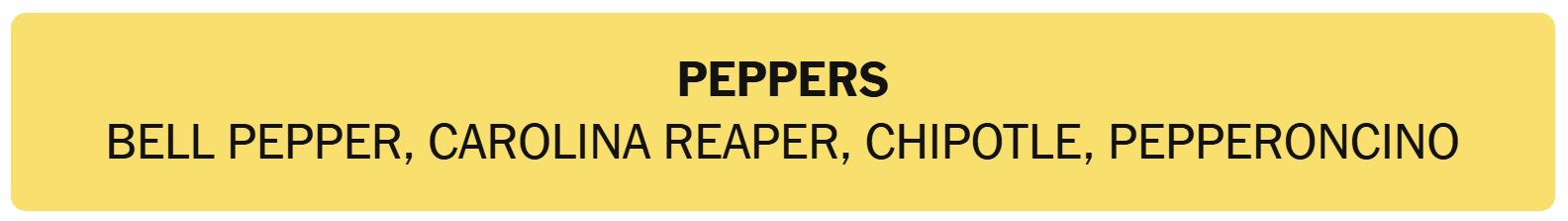- PEPPERS – BELL PEPPER, CAROLINA PEPPER, CHIPOTLE, PEPPERONCINO