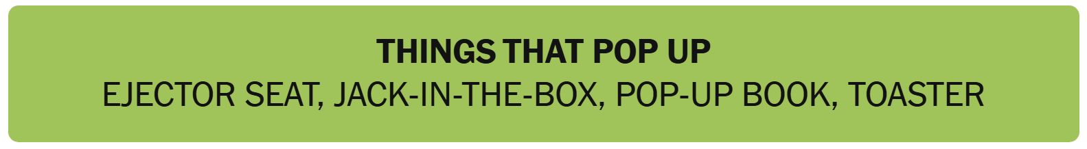 - THINGS THAT POP UP – EJECTOR SEAT, JACK-IN-THE-BOX, POP-UP BOOK, TOASTER