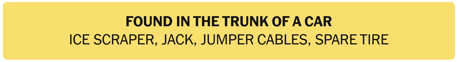 - FOUND IN THE TRUNK OF A CAR – ICE SCRAPER, JACK, JUMPER CABLES, SPARE TIRE