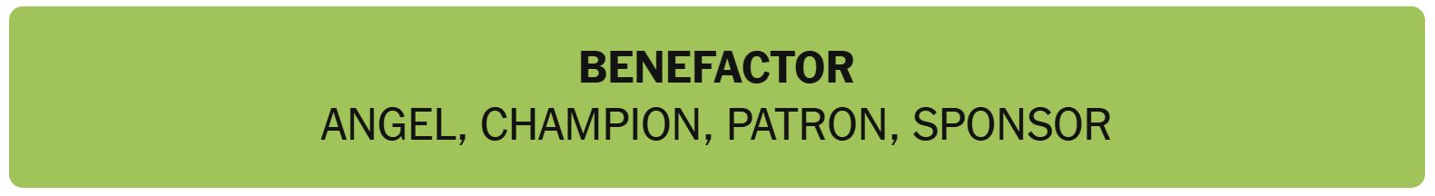 - BENEFACTOR – ANGEL, CHAMPION, PATRON, SPONSOR