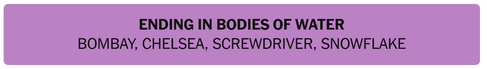 - ENDING IN BODIES OF WATER – BOMBAY, CHELSEA, SCREWDRIVER, SNOWFLAKE