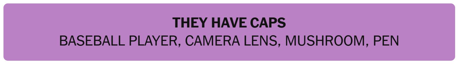 - THEY HAVE CAPS – BASEBALL PLAYER, CAMERA LENS, MUSHROOM, PEN