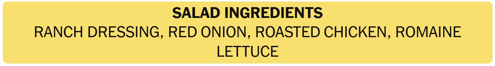 - SALAD INGREDIENTS – RANCH DRESSING, RED ONION, ROASTED CHICKEN, ROMAINE LETTUCE