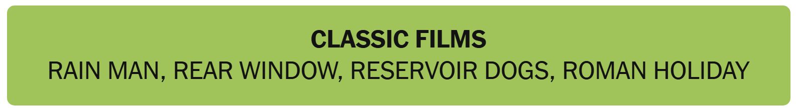 - CLASSIC FILMS – RAIN MAN, REAR WINDOW, RESERVOIR DOGS, ROMAN HOLIDAY