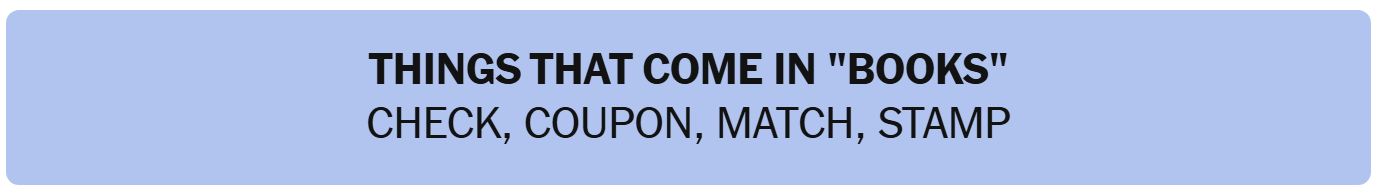 - THINGS THAT COME IN “BOOKS” – CHECK, COUPON, MATCH, STAMP