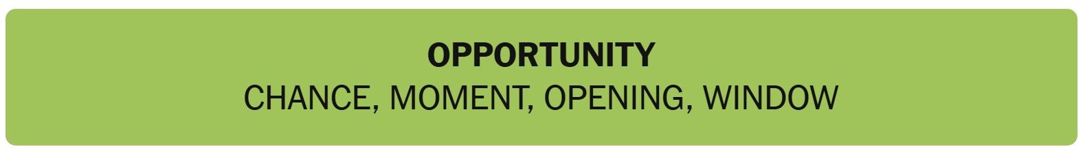 - OPPORTUNITY – CHANCE, MOMENT, OPENING, WIDOW