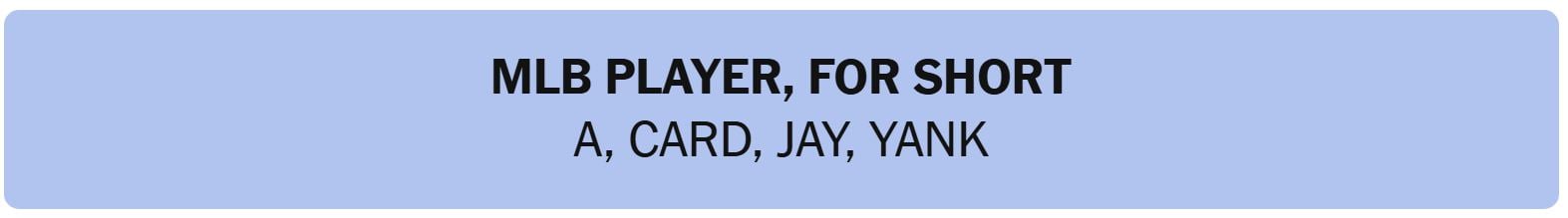 - MLB PLAYER, FOR SHORT – A, CARD, JAY, YANK