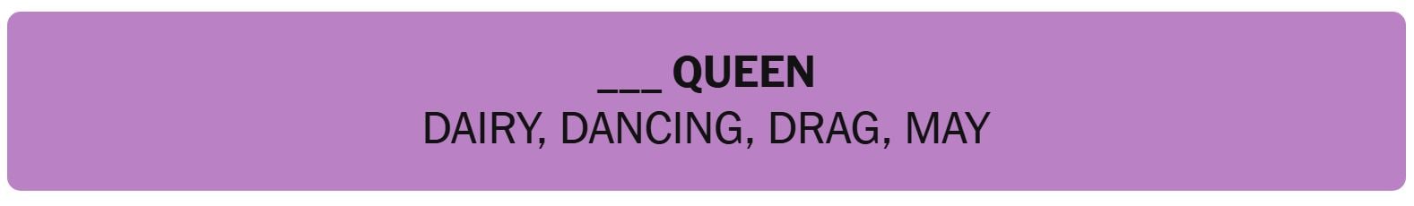 - ___ QUEEN – DAIRY, DANCING, DRAG, MAY