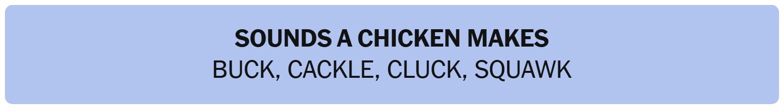 - SOUNDS A CHICKEN MAKES – BUCK, CACKLE, CLUCK, SQUAWK