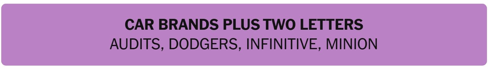 • CAR BRANDS PLUS TWO LETTERS – AUDITS, DODGERS, INFINITIVE, MINION