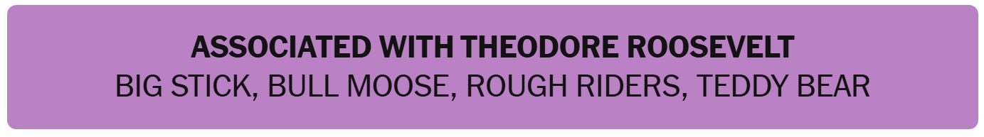 - ASSOCIATED WITH THEODORE ROOSEVELT – BIG STICK, BULL MOOSE, ROUGH RIDERS, TEDDY BEAR