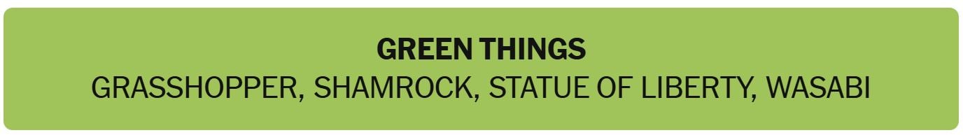 - GREEN THINGS – GRASSHOPPER, SHAMROCK, STATUE OF LIBERTY, WASABI