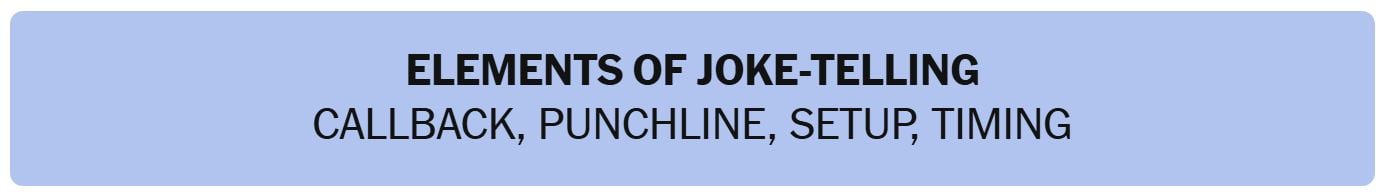 - ELEMENTS OF JOKE-TELLING – CALLBACK, PUNCHLINE, SETUP, TIMING