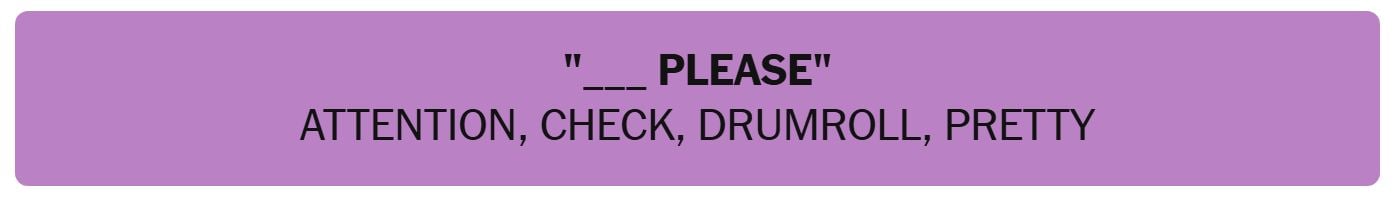 - “___ PLEASE” – ATTENTION, CHECK, DRUMROLL, PRETTY