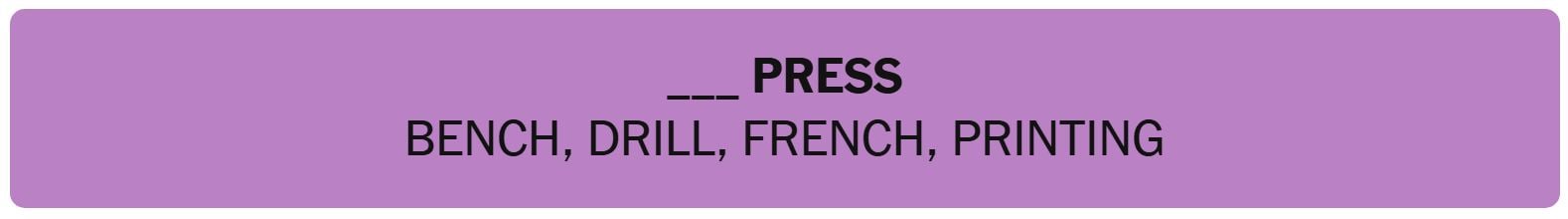 - “___ PRESS” – BENCH, DRILL, FRENCH, PRINTING