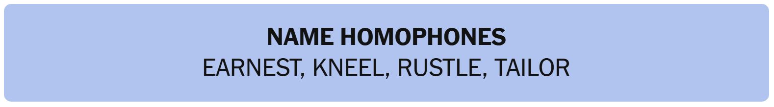 - NAME HOMOPHONES – EARNEST, KNEEL, RUSTLE, TAILOR