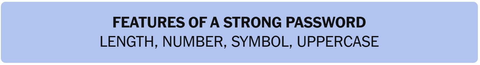 - FEATURES OF A STRONG PASSWORD – LENGTH, NUMBER, SYMBOL, UPPERCASE