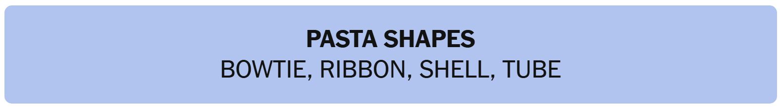 - PASTA SHAPES – BOWTIE, RIBBON, SHELL, TUBE