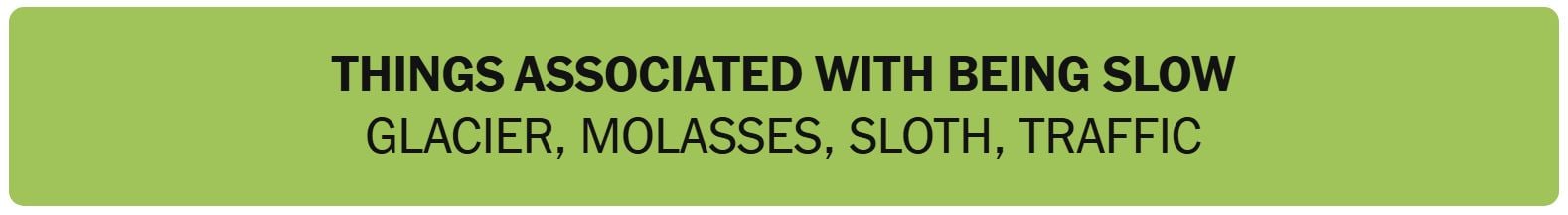 • THINGS ASSOCIATED WITH BEING SLOW – GLACIER, MOLASSES, SLOTH, TRAFFIC