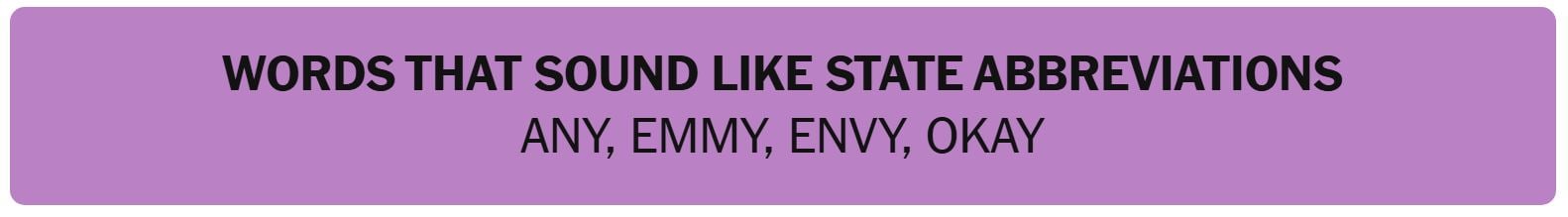• WORDS THAT SOUND LIKE STATE ABBREVIATIONS – ANY, EMMY, ENVY, OKAY