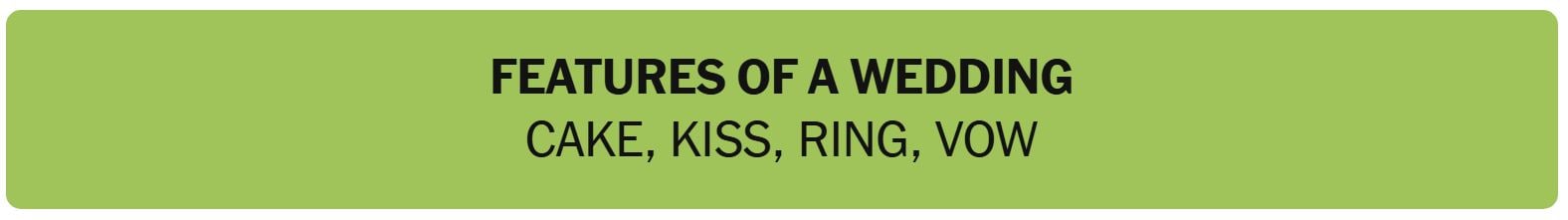• FEATURES OF A WEDDING – CAKE, KISS, RING, VOW