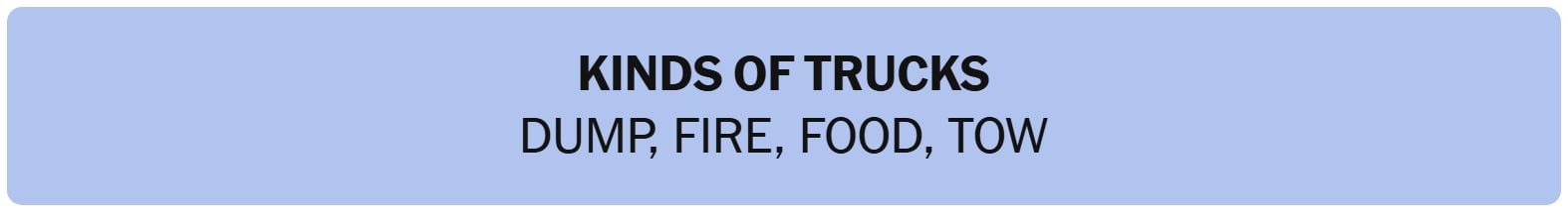 • KINDS OF TRUCKS – DUMP, FIRE, FOOD, TOW