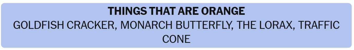 - THINGS THAT ARE ORANGE – GOLDFISH CRACKER, MONARCH BUTTERFLY, THE LORAX, TRAFFIC CONE