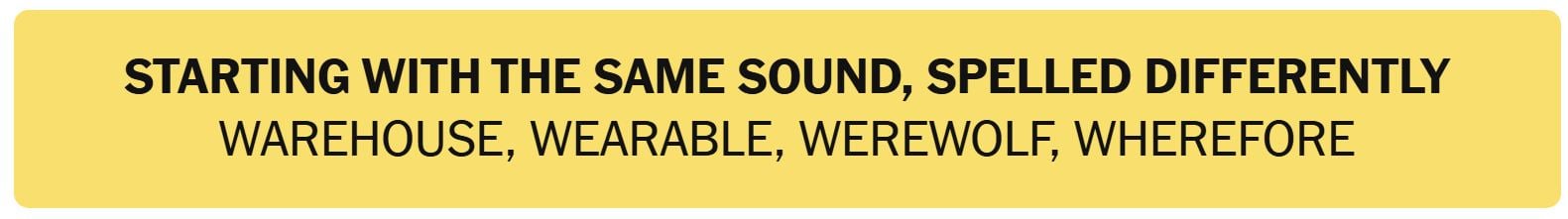 - STARTING WITH THE SAME SOUND, SPELLED DIFFERENTLY – WAREHOUSE, WEARABLE, WEREWOLF, WHEREFORE