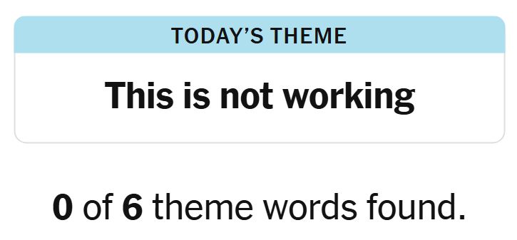 Today’s theme or trace for the puzzle is, “THIS IS NOT WORKING” and there are isx theme phrases to be discovered.