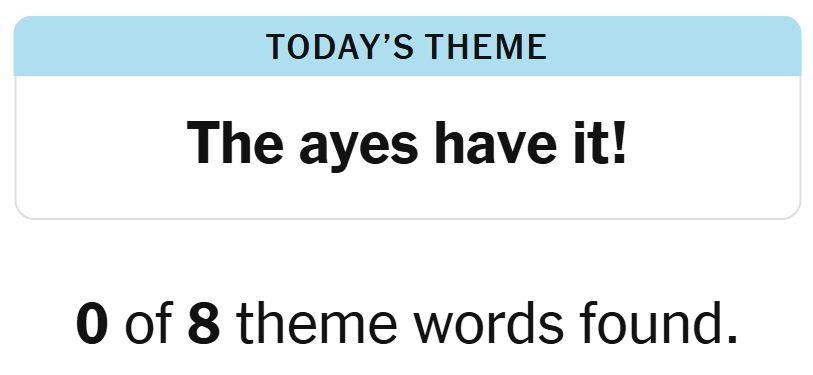 Today’s theme or trace for the puzzle is, “THE AYES HAVE IT!” and there are eight theme phrases to be discovered.