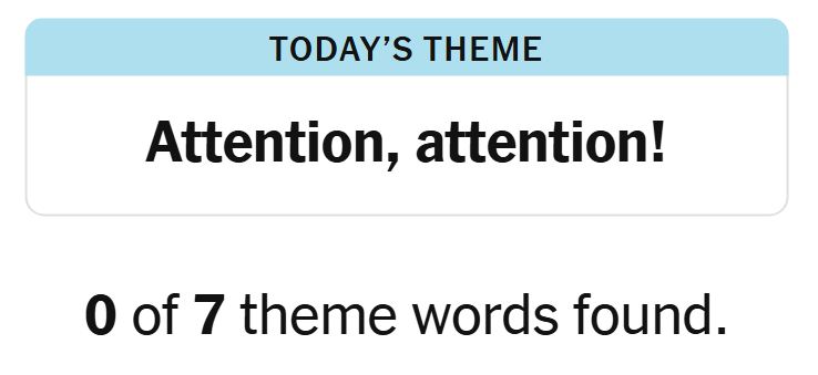 Today’s theme or trace for the puzzle is, “ATTENTION, ATTENTION!” and there are seven theme phrases to be discovered.