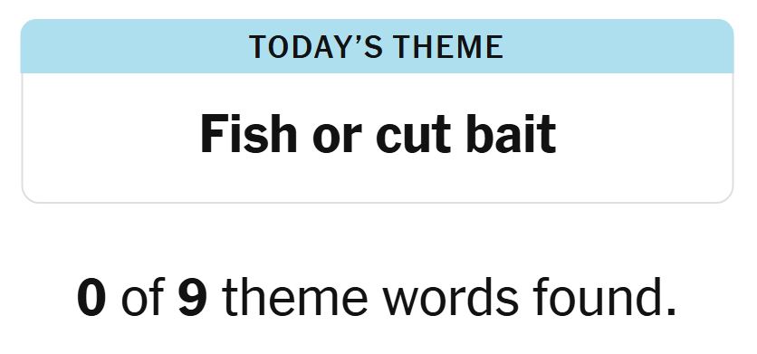 Today’s theme or trace for the puzzle is, “FISH OR CUT BAIT” and there are 9 theme phrases to be discovered.