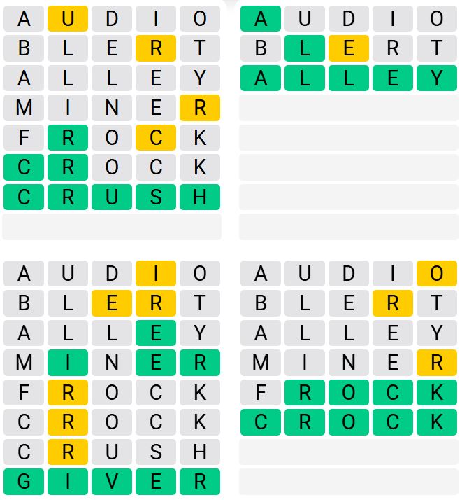 Tell us what number of makes an attempt it took you to guess as we speak’s Quordle under.