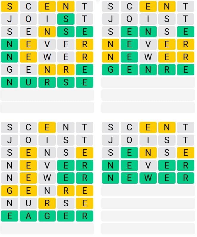 It’s the most well-liked each day phrase sport outdoors of Wordle because of the elevated degree of problem. Gamers should guess 4 five-letter phrases in as few as 9 makes an attempt, slightly than guessing one phrase.