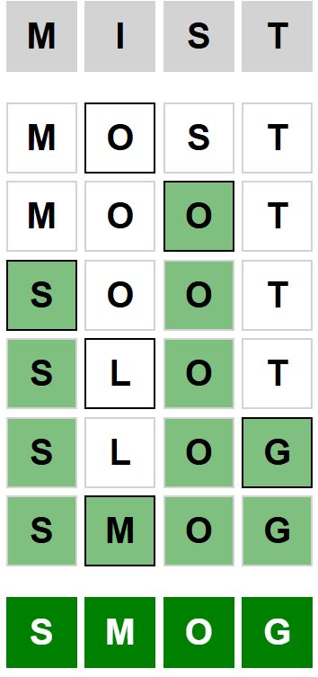 You want to change one letter in every subsequent phrase to get to the tip phrase, which might be performed by altering one letter within the backside phrase, making the optimum phrases 4, however this will not be the case for all Weaver puzzles.