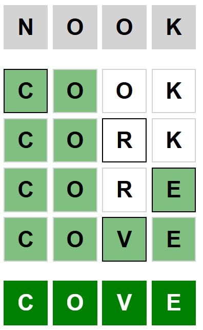 The starter phrase for the Weaver puzzle launched at this time, March 30th 2026, is ‘NOOK‘ and the top phrase is ‘COVE‘.