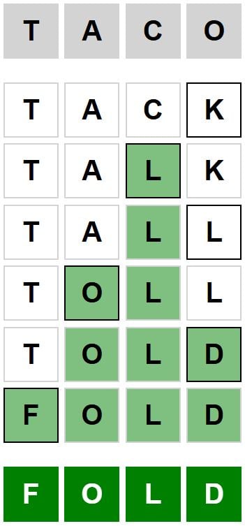 The starter phrase for the Weaver puzzle launched at present, March 20th 2026, is ‘TACO‘ and the top phrase is ‘FOLD‘.