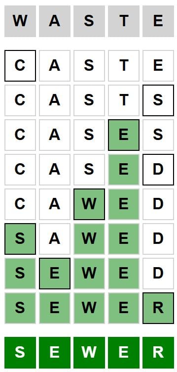 You want to change one letter in every subsequent phrase to get to the top phrase, which may very well be finished by altering one letter within the backside phrase, making the optimum phrases 4, however this is probably not the case for all Weaver puzzles.