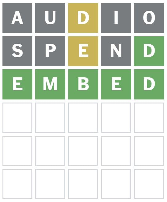 Right here is how I managed to resolve Wordle 1695 in three guesses in the present day. I guessed the phrase ‘AUDIO’ first, which is my regular starter phrase.