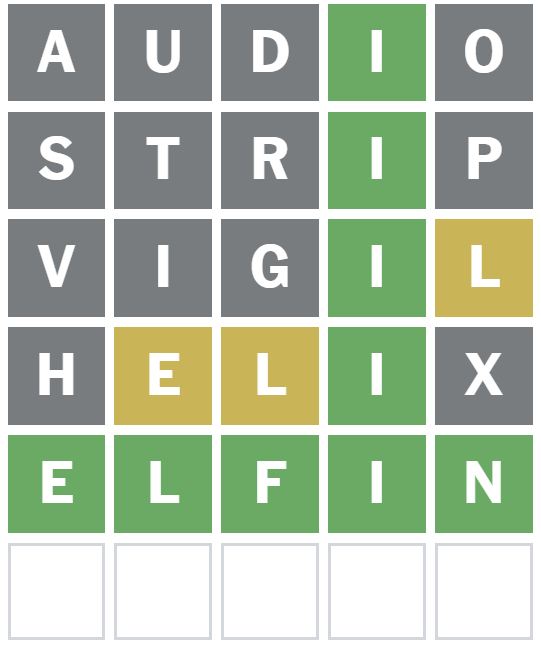 ‘HELIX’ was the phrase I considered subsequent. No different letters had been positioned accurately with this guess, nevertheless it did present me there’s an E within the Wordle reply right now.