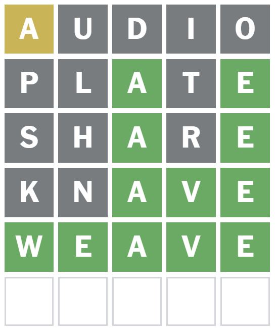 Right here is how I managed to resolve Wordle 1766 in 5 guesses at present. I guessed the phrase ‘AUDIO’ first, which is my typical starter phrase.